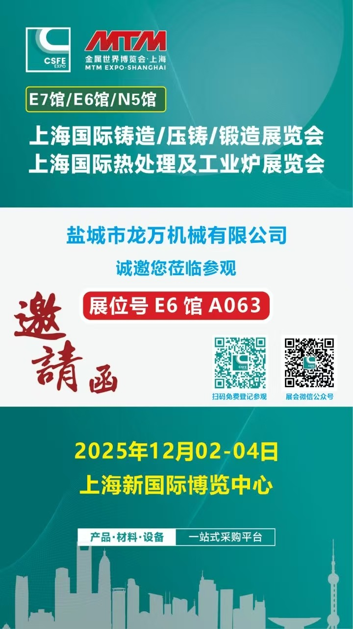 Yancheng Longwan Machinery Co., Ltd. kommer att delta i "Shanghai International Steel/Die Casting/Foundry Exhibition" och "Shanghai International Heat Treatment and Industrial Furnace Exhibition" som hålls på Shanghai International Expo Center från 2:a till 4:e december 2025. Denna utställning lockar många ledande företag inom stål- och gjutgodsindustrin. Yancheng Longwan Machinery Co., Ltd. kommer att använda denna plattform för att visa upp sina senaste teknologier och innovativa produkter inom maskintillverkning.